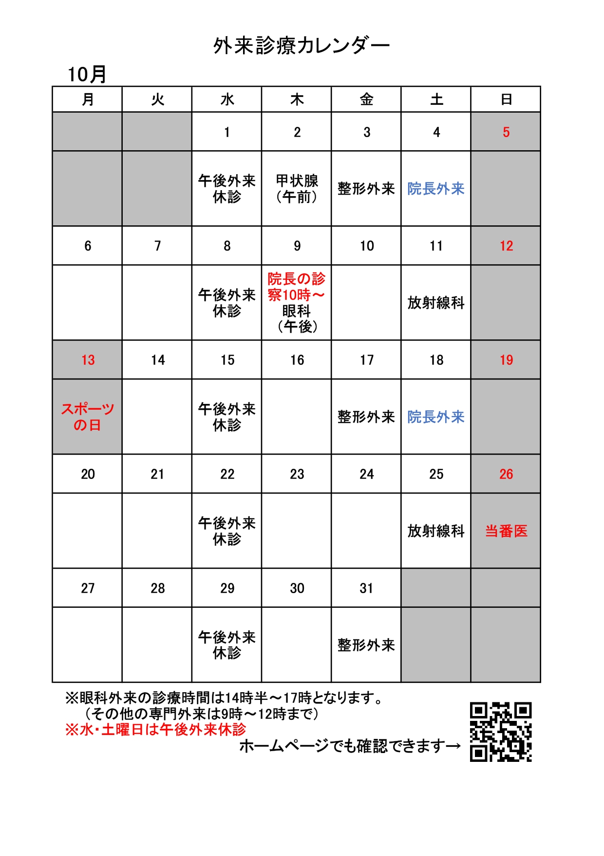 10月専門外来カレンダー | 指宿市-南記念クリニック