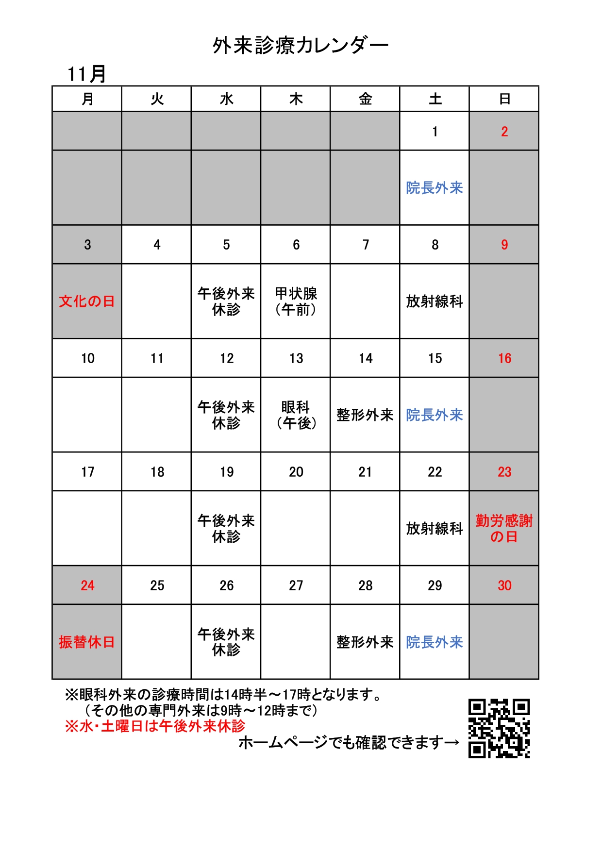 11月専門外来カレンダー | 指宿市-南記念クリニック