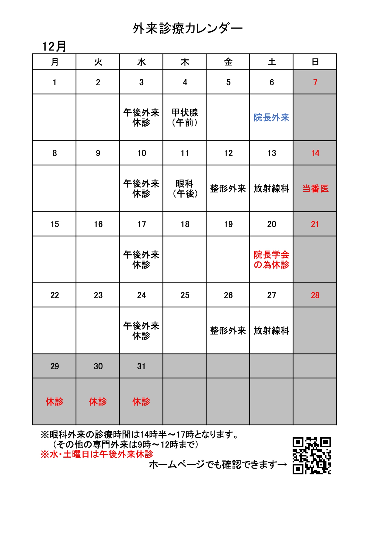 12月専門外来カレンダー