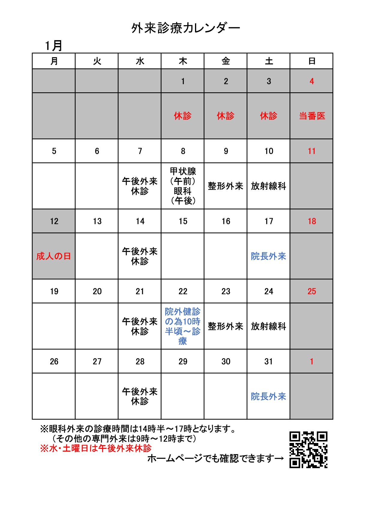 1月専門外来カレンダー